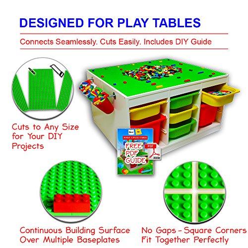 THE MOST POPULAR BASE PLATE USED TO BUILD PLAY TABLES AND WALLS BECAUSE [1] The edges connect together seamlessly, [2] The square corners fit together perfectly with no gaps; preferred over baseplates with rounded corners, [3] Easily cuts to any size, [4] FREE DIY table guide with easy-to-follow instructions delivered to you by email. Excellent supplement to the STEM education curriculum.