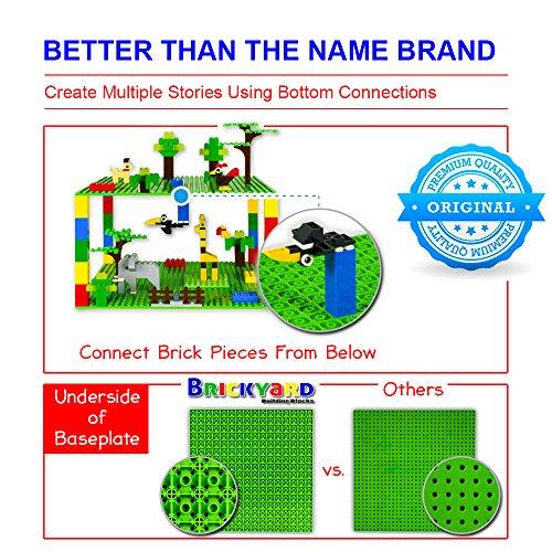 STACKABLE WITH BOTTOM CONNECTIONS Our baseplates give you the added benefit of connecting building bricks from below to create multiple levels/stories. Name brand baseplates do not offer this feature. Our baseplates are 100% compatible and proven to work with ALL major brands of building bricks. THE #1 HIGHEST RATED & MOST REVIEWED BASEPLATE ON AMAZON Join the hundreds of thousands of satisfied customers who have already purchased our best-selling baseplates. Because we're SO confident you'll love this baseplate too, it's backed by our NO-HASSLE SATISFACTION GUARANTEE. If you don't love it for any reason, you can return it for a full refund. THE STRONGEST, TOUGHEST, AND MOST DURABLE BASEPLATE EVER MADE - BUILT TO LAST A LIFETIME! A premium quality base plate that is double the thickness and twice as strong as the name brand! We guarantee you can feel the difference in quality. Our base plates have been tested to comply with all U.S. toy safety standards and are free of lead, cadmium, and phthalates. THE MOST POPULAR BASE PLATE USED TO BUILD PLAY TABLES AND WALLS BECAUSE [1] The edges connect together seamlessly, [2] The square corners fit together perfectly with no gaps; preferred over baseplates with rounded corners, [3] Easily cuts to any size, [4] FREE DIY table guide with easy-to-follow instructions delivered to you by email. Excellent supplement to the STEM education curriculum. 5 DIFFERENT COLORS FOR YOU TO CHOOSE FROM Our building brick baseplates come in green, gray, blue, sand (tan), and white colors. To see the different multi-pack color options, see above. DISCLAIMER: LEGO is a trademark of the LEGO Group of companies which does not sponsor, authorize or endorse this product.