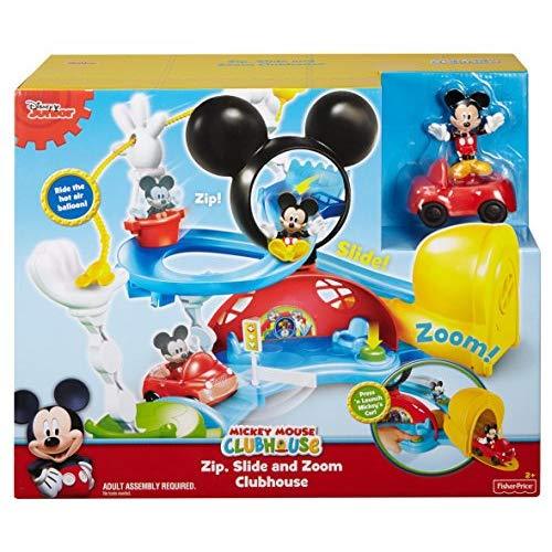 Welcome to Disney Junior's Mickey Mouse Clubhouse! Mickey Mouse is ready for a wild ride as he begins his journey in his hot air balloon! Raise the zip line and Mickey "flies" down in his balloon, landing on the lookout tower. Then Mickey takes a magical ride down the spiral slide, which swirls around the Clubhouse and ends in his boot-shaped garage where he lands right in his red car. Press the button inside the Clubhouse and Mickey's car launches out of the garage. Mickey can make a stop inside the Clubhouse and visit Toodles, hang out with the rest of the gang (sold separately), or go over the bridge and back to the balloon stand and start all over again! Zip, Slide And Zoom Clubhouse comes with a 3-inch (7.62cm) poseable Mickey figure and his classic red car. Other figures and accessories sold separately and subject to availability.