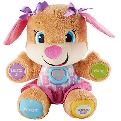 Sis is soft, cuddly, and she's ready to make sure the learning fun never ends! She responds to your baby's touch with exciting sing-along songs and phrases that introduce more than 100 first words, parts of the body, colors, shapes and more! And because every baby develops at their own pace, Sis comes with Smart Stages technology, so you can choose the level that's best for your child. There are a variety of songs, sounds and phrases within each of the three levels of play. And Sis's light-up, multicolor heart even twinkles along to the music! Level 1 – Explore – Baby can press Sis's hands, foot, heart, or ear to hear first words, colors, the alphabet, parts of the body and more! Level 2 – Encourage – In this level, fun phrases reward little ones as they're encouraged to count along, find colors, and identify parts of the body! Level 3 – Pretend – Sis is ready to play pretend with fun sing-along songs and phrases that engage toddlers in exciting and imaginative play, all while expanding their vocabulary!