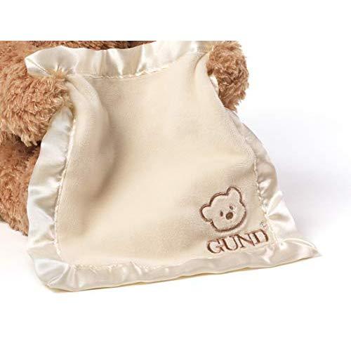 GUND combined one of baby’s favorite games with a soft and adorable animated plush toy. Peek-A-Boo Bear features a movable mouth and arms, as well as a satin-accented blanket that provides additional tactile sensation. At the push of a button, the bear recites one of six different phrases and hides behind a blanket before popping back out to delight baby with an interactive game of peek-a-boo. Available in an on-trend tan color that’s a unique alternative to the traditional pink or blue — perfect for baby girls and boys alike. Three “AA” batteries included. Surface-washable. All ages. About GUND: For more than 100 years, GUND has been a premier plush company recognized worldwide for quality innovative products. Building upon our award-winning and beloved plush designs, we continue to practice innovation by constantly developing new original and licensed designs to appeal to the next generation of customers. To that end, each one of our plush toys is constructed from premium materials for unparalleled softness and huggability.