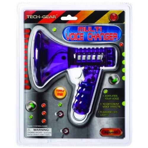 Enjoy hours of laughter and fun with the Tech-Gear Multi Voice Changer. Experiment with the science of sound using this electronic voice synthesizer, featuring 10 different voice modifiers. Side levers adjust frequency and amplitude, creating hundreds of different sound combinations. Effects include a voice amplifier and colorful flashing LEDs. A fun toy for kids and adults alike. One 9-volt battery included.