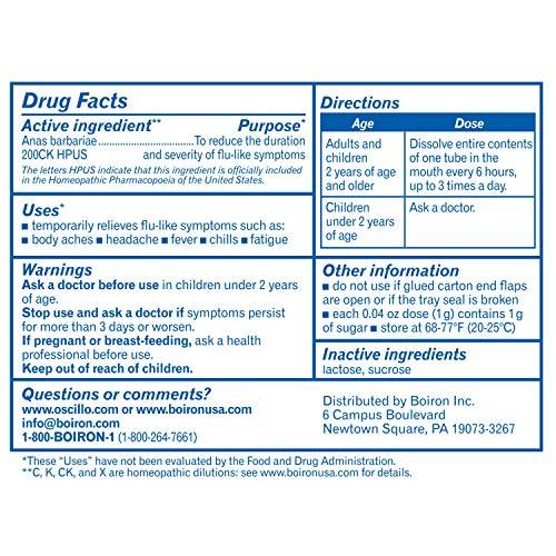 HOMEOPATHIC FLU RELIEF: Oscillococcinum works with your body to help temporarily relieve fatigue, headache, body aches, chills & fever. Safe for ages 2 & up, take at the first sign of flu-like symptoms.