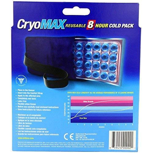 Cryo-MAX Cold Packs have been designed with a unique, technological design that allow the cold pack to remain cold for up to eight hours. The medium size Cryo-MAX cold pack is 12" x 6", comes with an adjustable support wrap with velcro straps and is recommended for use on the elbow, foot, face or hands.