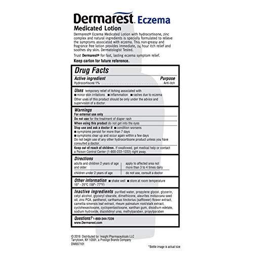 Dermarest Eczema Medicated Lotion with hydrocortisone is specially formulated to relieve the symptoms associated with eczema. This non-greasy, fragrance free lotion contains a moisture boosting zinc complex, and the unique combination of hydrocortisone, skin softeners and emollients provides immediate 24-hour itch relief when used as directed and restores skin's moisture. Dermatologist tested Dermarest Eczema Medicated Lotion helps prevent recurring dryness and soothes and softens skin to help improve overall skin health. Trust Dermarest for fast, lasting eczema symptom relief.