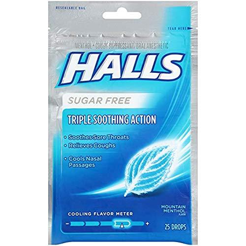 Halls Advanced Formula Sugar Free Triple Soothing Action Mountain Menthol Cough Suppressant Drops. Resealable bag. Fast relief. Starts working within 10 seconds. Menthol, cough suppressant/oral anesthetic. Enlarged. Soothes sore throats. Relieves coughs. Cools nasal passages. FreshLock Zipper. 25 drops.