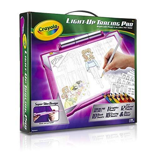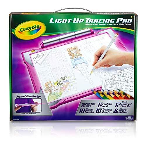 Kids can draw like a pro with the Crayola light-up tracing pad in Pink, featuring over 35 art tools to inspire the imagination. Using the included fashion and animal tracing sheets, or the hundreds of downloadable online images, children ages six and older can draw creative scenes with crisp, clean lines. The kit includes a graphite pencil, tracing sheets, blank sheets, as well as colored pencils for drawing, illustrating, and coloring. The pad runs on three AA batteries (not included) and makes tracing easy, fun, and accessible. This makes a great travel activity pad, and is perfect as a girl's holiday or birthday present idea!