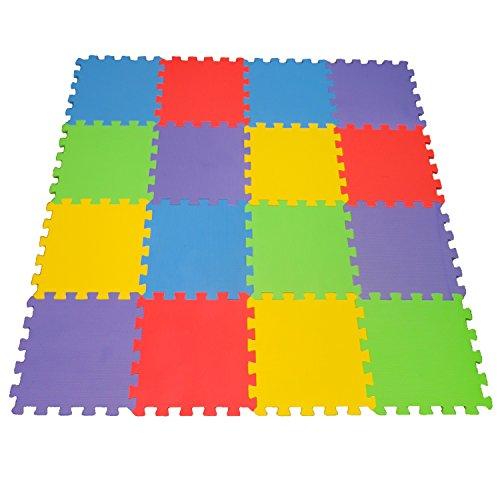 Easy to Interlock, Stacks nicely and makes for a compact storage, 16 colorful EVA foam tiles, each tile measures 12" x 12" x 0.4" (315mm x 315mm x 10mm); covers an area of 16 SQ. FT, easy to clean