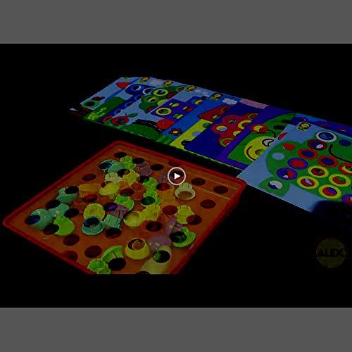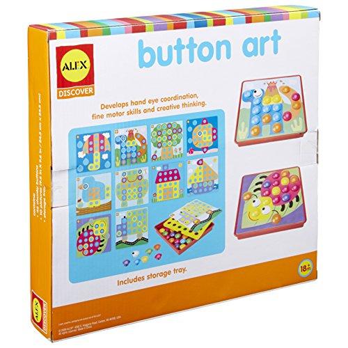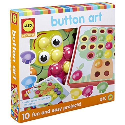 ALEX Discover Button Art comes with over 40 buttons and 10 pictures for hours of artistic fun. This toy is designed for preschoolers to develop hand-eye coordination, fine motor skills and creative thinking. It also comes with a wide storage tray to keep everything together. All your child has to do is match and snap the chunky buttons to complete the pictures. The pictures include a frog, bird, house, tree, truck, and more, all perfect for little ones learning how to use their creativity. Pick everything up and place back into the wide storage tray for a fast and easy cleanup. Includes 46 colorful buttons, 10 different pictures and a 2-piece storage tray. Recommended for children 18 months of age and older.