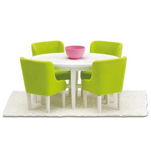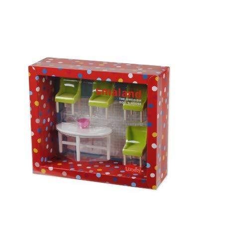 The perfect modern update to any doll house, the Lundby Smaland Dining Room Set will give a contemporary flair to any dining space. A chic white table and four green upholstered chairs are comfortable for Lundby Smaland Dolls and fit easily inside doll houses. A white area rug and pink bowl help set the scene. Crafted to a 1:18 scale and suitable for dolls around 4" tall. Lundby doll house, dolls and other accessories are sold separately. Since 1945, Lundby dollhouses have been crafted with the utmost love and care. Grete Thomson first designed these miniatures for her niece and they were so cherished that the soon the Lundby business was created. Known for their realistic detail and contemporary Swedish design, Lundby Smaland accessories will breathe life into any doll house or miniature setting.